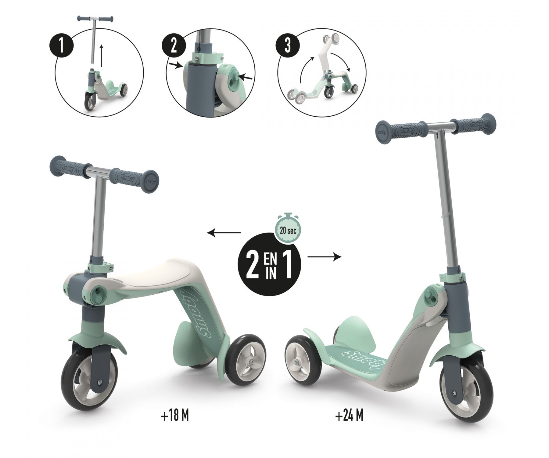 La patinette 2 en 1 de SMOBY est un véhicule hybride qui peut être transformé en draisienne sans outil. La hauteur du guidon est réglable (53/63cm) et les 3 roues sont silencieuses.