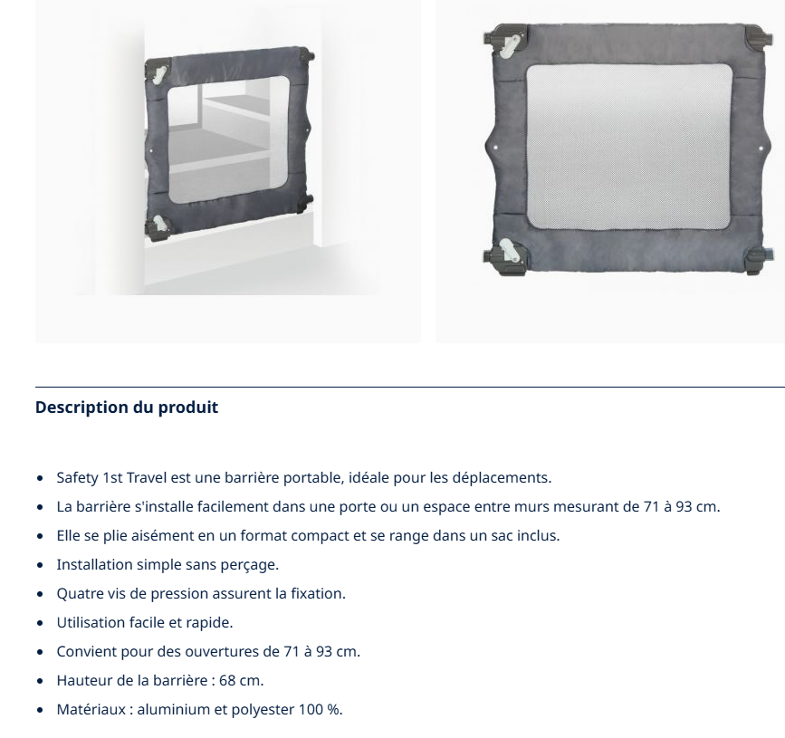En vidéo : VIDEO BARRIÈRE DE SÉCURITÉ PORTABLE POUR BÉBÉ POUR UN USAGE OCCASIONNEL – adaptée à des ouvertures entre 71 cm et 93 cm PARFAITE POUR VOYAGER – une barrière de sécurité idéale pour de petits voyages, des vacances tant désirées ou une visite chez les grands-parents BARRIÈRE D'ESCALIER AVEC FIXATION PAR PRESSION – assure une installation facile avec une fixation robuste POIGNÉES DE FIXATION À PRESSION INCLUSES – pour faciliter la mise en place de la barrière d'escalier Safety 1st, son retrait et sa remise en place PLIAGE COMPACT – permet de ranger la barrière de porte et d'escalier en toute simplicité lorsqu'elle n'est pas utilisée SAC DE VOYAGE INCLUS – pour transporter la légère barrière d'escalier rétractable dans n'importe quel type de voyage NOTICE EXPLICATIVE :safety-1st-barriere-de-securite-de-voyage-3220660204816.pdf