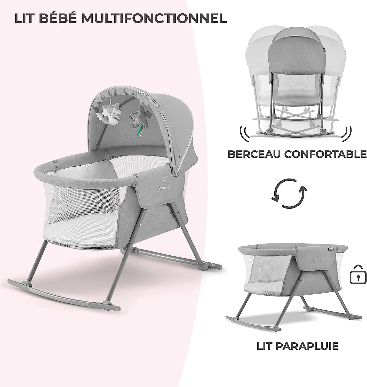 *Kinderkraft LOVI Lit bébé 3 en 1, Berceau bébé, Lit parapluie, avec Matelas Sac de Transport Moustiquaire, 2 jouets doux inclus, Grande capote réglable, Circulation de l'air, Gris