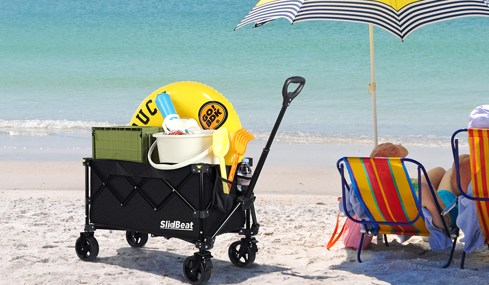 Heureusement, le chariot de plage est là ! Il avale serviettes, jouets, glacières, parasol et même le seau rempli de coquillages que votre petit dernier veut absolument emmener.