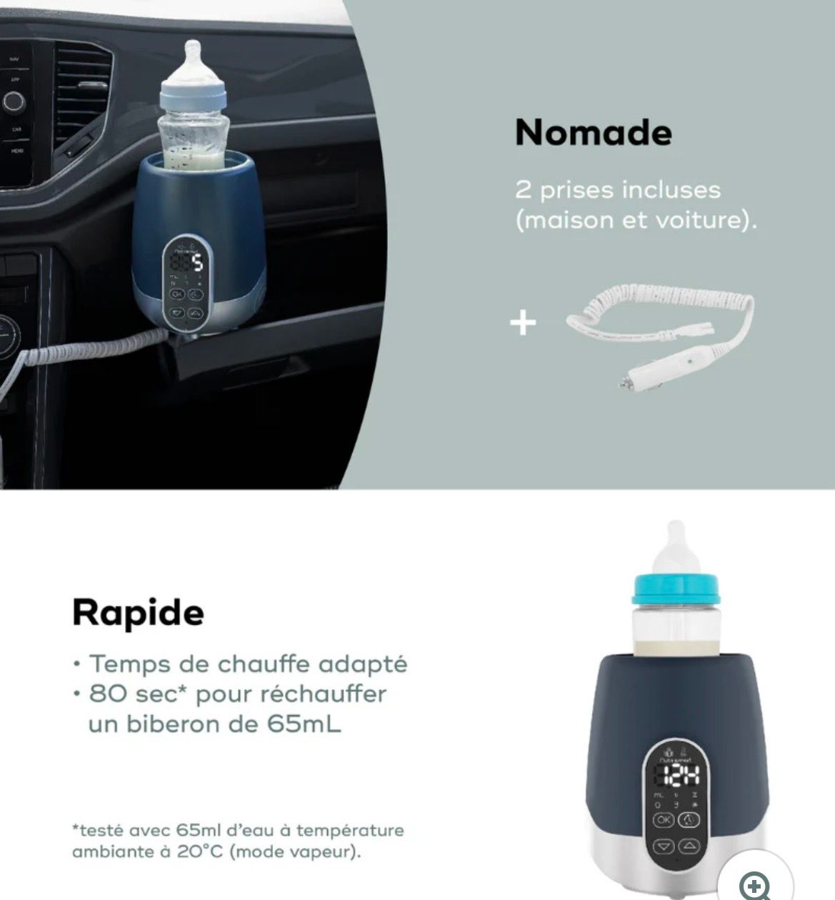 Pour votre séjour de 3 a 15 jours: Le chauffe-biberon qui permet de chauffer rapidement à la bonne température le lait maternel, les biberons et les petits pots Cuve de 8 cm de diamètre adaptée à la plupart des biberons et des petits pots Intelligent : le chauffe-biberon ajuste automatiquement le temps de chauffe pour atteindre la température idéale Programme différé : lance la chauffe automatiquement pendant la nuit + fonction "Maintien au chaud". Idéal pour les nuits et les matins difficiles ! Mode Bain Marie pour préserver tous les bienfaits du lait maternel Mode Vapeur pour chauffer en un temps record : seulement 80 secondes pour réchauffer 65 ml d'eau à 37°