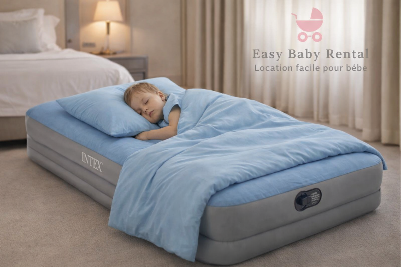 Pour votre séjour en Vacances sur Cannes et son secteur de 3 à 15 Jours . Louez un lit bébé confortable pour vos vacances. Livraison à l’hôtel ou Airbnb. Parure de draps complète loué séparément : ( Housse de couette / couette - Oreiller / Taie d'oreiller et draps housse pour le matelas + alèse ) Lit gonflable INTEX est conçu pour une personne. Il mesure 1,91 x 0,99 x 0,30 m et peut supporter un poids maximum de 136 kg. Le temps de gonflage est de 3 minutes grâce au gonfleur électrique intégré. Le matelas a une hauteur de 30 cm et offre un accueil tonique et un soutien équilibré