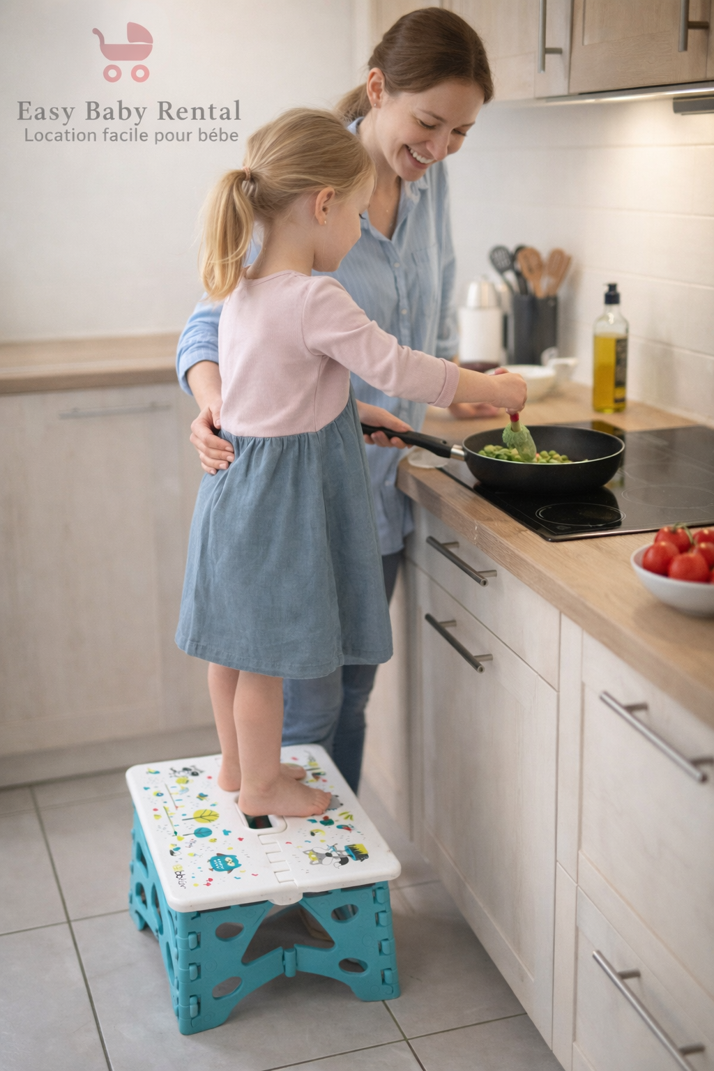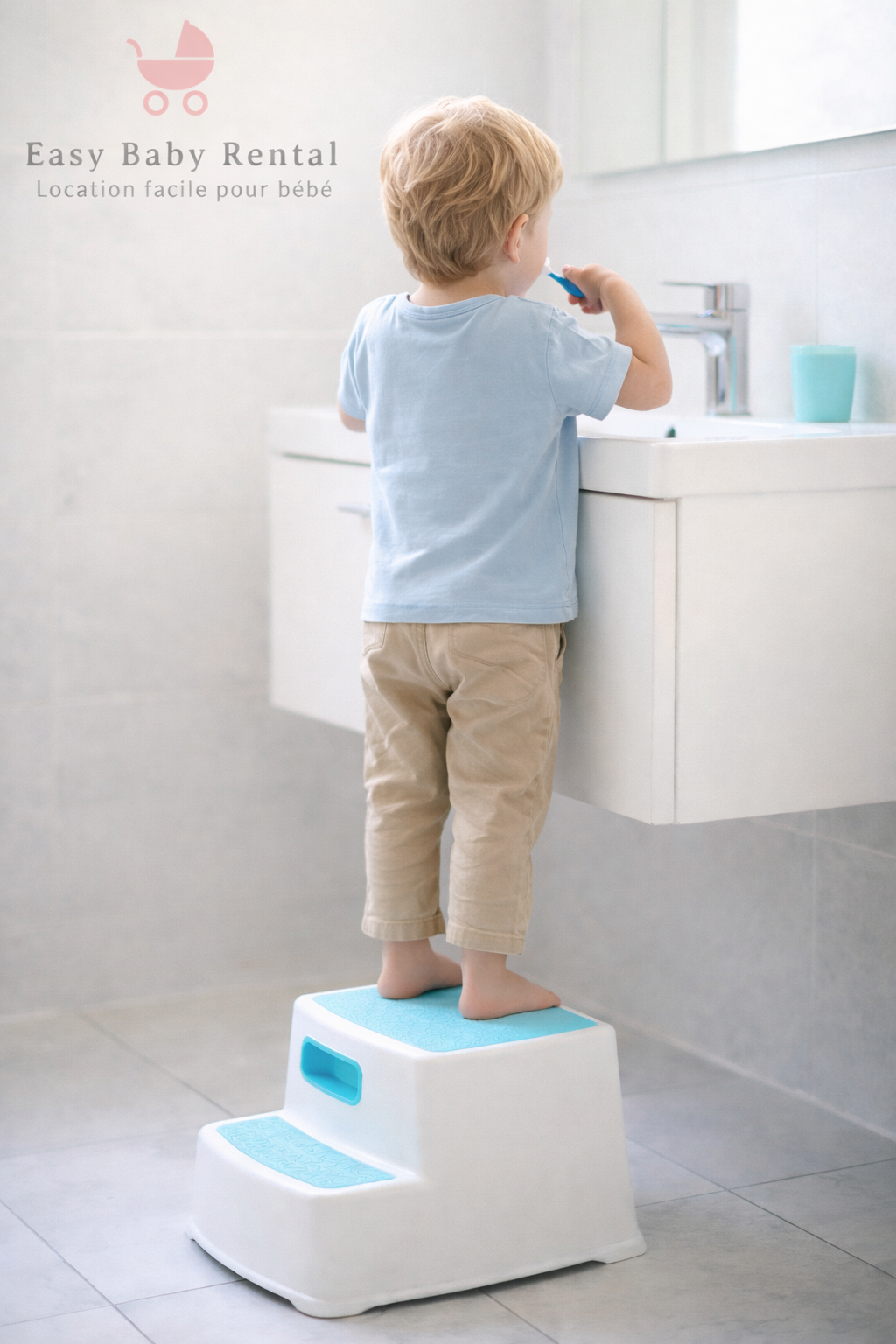 Location de marchepied enfant sécurisé avec Easy Baby Rental. Idéal pour salle de bain, autonomie et sécurité des tout-petits. Léger, compact et facile à transporter, il accompagne votre enfant dans tous ses gestes du quotidien. Disponible en location courte durée de 3 à 15 jours .