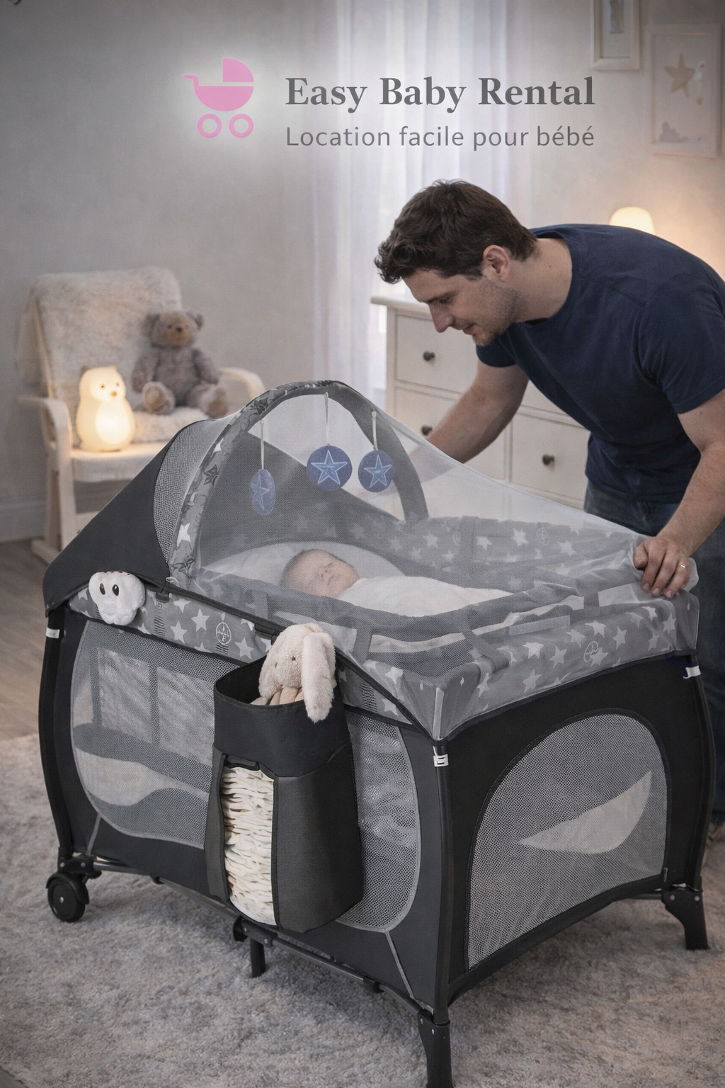 Pour votre séjour de 3 à 15 Jours Mini lit parapluie de la naissance à 2 ans Lit Bébé pliant avec Table à Langer, Matelas & Moustiquaire, 3 Jouets Mignons & Boîte à Musique, Gris