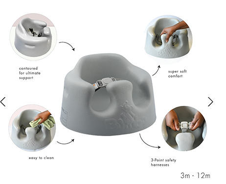 Le siège Bumbo®® de plancher a été conçu de façon à ne pas restreindre complètement votre bébé. Il est muni d’un harnais de sécurité durable à trois points pour empêcher les bébés de tomber tout en leur permettant de continuer à gigoter comme ils savent si bien le faire.