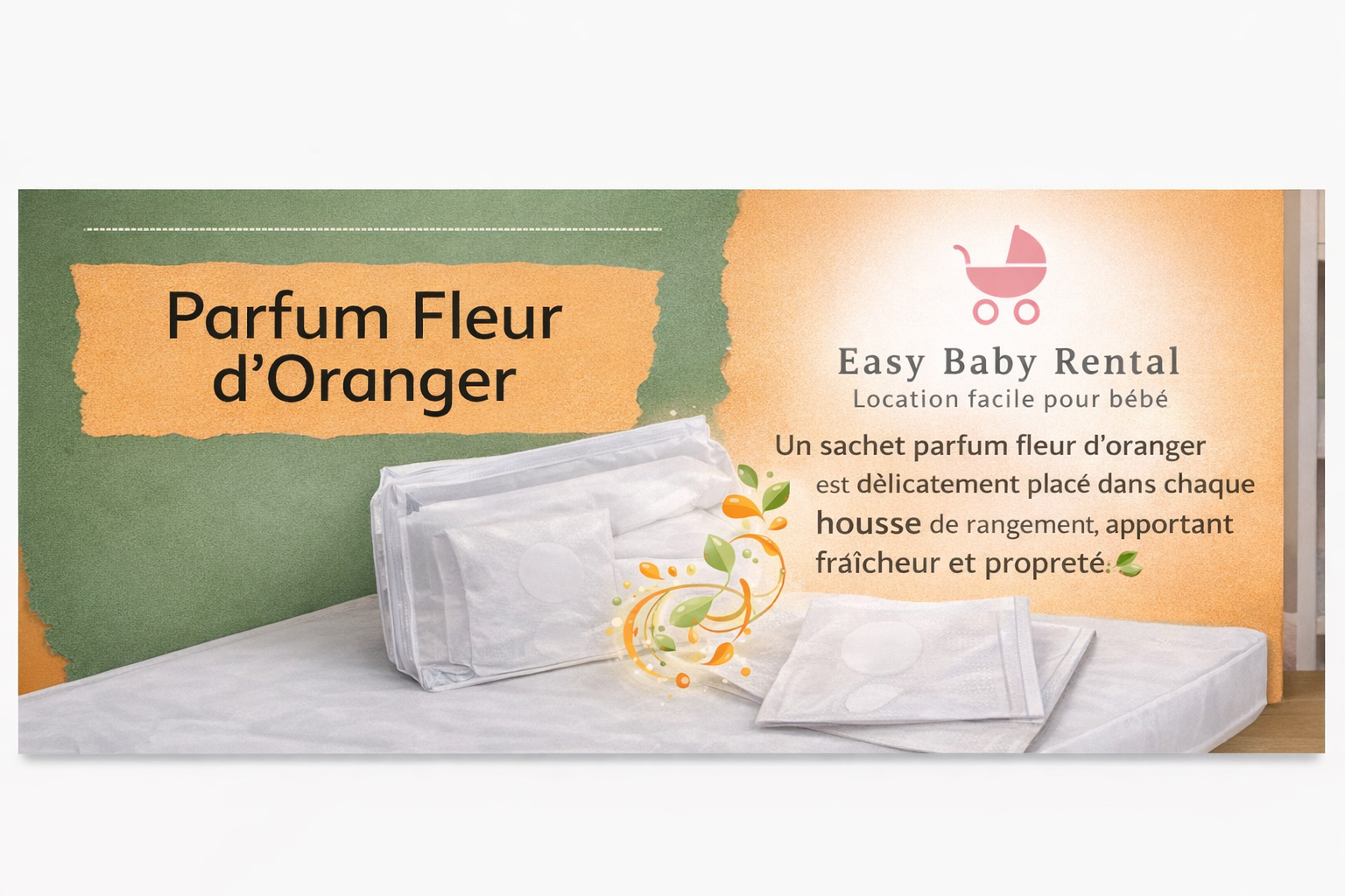 Pour le confort et le bien-être de votre bébé, tous les articles sont délicatement stockés dans une housse de rangement avec des sachets parfumés à la fleur d’oranger, offrant fraîcheur, douceur et propreté..